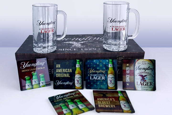 A high quality set of glass coasters and two tankards comes in a wooden box with custom foam inserts. An awesome display piece for any home bar.