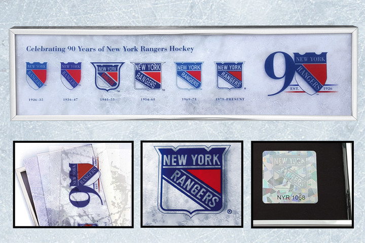 Exclusive Season Ticket holder give away designed for the NY Rangers celebrating their 90 years as a professional hockey team. Features Ranger's team logo history suspended over an ice effect piece of acrylic. Truly a unique piece.